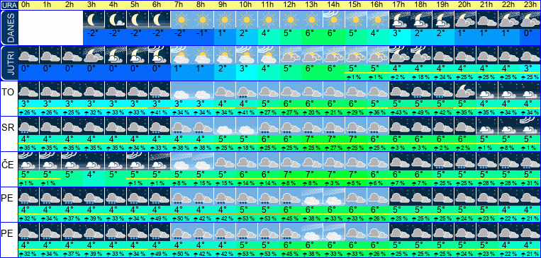 | Ura | 02h | 03h | 04h | 05h | 06h | 07h | 08h | 09h | 10h | 11h | 12h | 13h | 14h | 15h | 16h | 17h | 18h | 19h | 20h | 21h | 22h | 23h | | | |  |  |  |  |  |  |  |  |  |  |  |  |  |  |  |  |  |  |  |  |  |  | | Temperatura [C°] | -2°C | -2°C | -2°C | -2°C | -2°C | -2°C | -1°C | 1°C | 2°C | 4°C | 5°C | 6°C | 6°C | 5°C | 4°C | 3°C | 2°C | 2°C | 1°C | 1°C | 1°C | 0°C | | Občutek [C°] | -6°C | -6°C | -6°C | -6°C | -6°C | -5°C | -4°C | -3°C | -1°C | 1°C | 2°C | 3°C | 3°C | 2°C | 1°C | -0°C | -1°C | -2°C | -2°C | -3°C | -3°C | -3°C | | Možnost padavin | | | | | | | | | | | | | | | | | | | | | | | | Količina padavin [mm] | | | | | | | | | | | | | | | | | | | | | | | Sneg [cm] | | | | | | | | | | | | | | | | | | | | | | | | UV index | | | | | | | | | | UV 1 | UV 1 | UV 1 | UV 1 | UV 1 | | | | | | | | | | Hitrost vetra | 3 km/h | 3 km/h | 3 km/h | 3 km/h | 3 km/h | 4 km/h | 3 km/h | 3 km/h | 3 km/h | 3 km/h | 3 km/h | 4 km/h | 4 km/h | 4 km/h | 4 km/h | 5 km/h | 5 km/h | 5 km/h | 5 km/h | 5 km/h | 4 km/h | 4 km/h | Smer vetra | J | J | J | J | J | Z | V | J | V | V | V | V | V | S | S | S | Z | S | S | S | S | S | | Zračni tlak | 1017 | 1017 | 1017 | 1017 | 1017 | 1017 | 1017 | 1017 | 1017 | 1017 | 1016 | 1016 | 1016 | 1016 | 1016 | 1016 | 1017 | 1017 | 1018 | 1018 | 1018 | 1019 | | Vlaga | 83 % | 83 % | 82 % | 81 % | 81 % | 79 % | 76 % | 71 % | 65 % | 58 % | 56 % | 56 % | 57 % | 61 % | 64 % | 68 % | 71 % | 73 % | 75 % | 76 % | 77 % | 77 % |