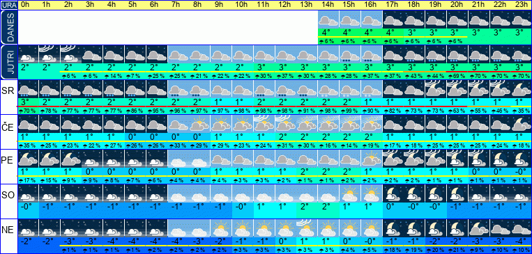 | Ura | 12h | 13h | 14h | 15h | 16h | 17h | 18h | 19h | 20h | 21h | 22h | 23h | | | | | | | | | | | | | |  |  |  |  |  |  |  |  |  |  |  |  | | Temperatura [C°] | 4°C | 4°C | 4°C | 4°C | 4°C | 4°C | 3°C | 3°C | 3°C | 3°C | 3°C | 3°C | | Občutek [C°] | 1°C | 1°C | 1°C | 1°C | 1°C | 1°C | 1°C | 1°C | 1°C | 0°C | 0°C | 0°C | | Možnost padavin | 6 % | 6 % | 6 % | 6 % | 6 % | 6 % | 6 % | 6 % | 6 % | | | | | Količina padavin [mm] | | | | | | | | | | | | | Sneg [cm] | | | | | | | | | | | | | | UV index | | | | | | | | | | | | | | Hitrost vetra | 4 km/h | 4 km/h | 4 km/h | 4 km/h | 4 km/h | 4 km/h | 4 km/h | 4 km/h | 4 km/h | 4 km/h | 3 km/h | 3 km/h | Smer vetra | V | V | V | V | V | V | V | V | S | S | S | S | | Zračni tlak | 1018 | 1018 | 1018 | 1017 | 1017 | 1017 | 1017 | 1018 | 1018 | 1018 | 1018 | 1017 | | Vlaga | 83 % | 81 % | 80 % | 79 % | 80 % | 81 % | 83 % | 84 % | 86 % | 87 % | 88 % | 89 % |