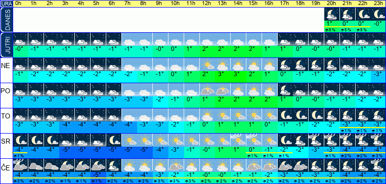 | Temperatura: | -1°C / 1°C / 3°C (+-1°C) | Možnost padavin: | 5 % | Hitrost vetra: | 3 / 5 / 7 km/h (+-1) | Skupna oblačnost: | 5 / 54 / 90 % (+-19) |