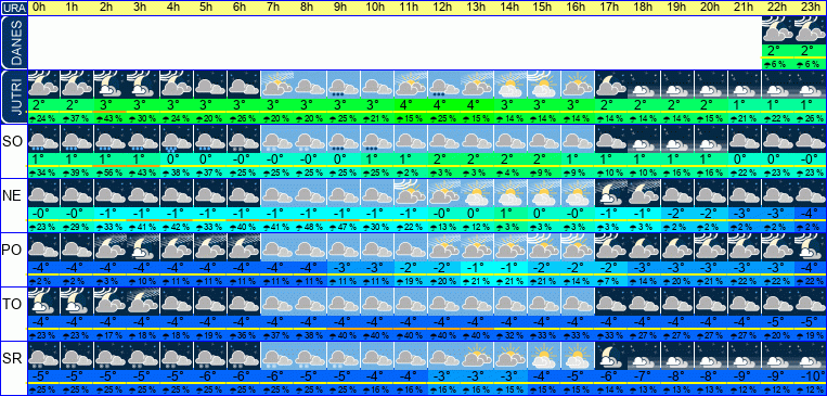 | Ura | 00h | 01h | 02h | 03h | 04h | 05h | 06h | 07h | 08h | 09h | 10h | 11h | 12h | 13h | 14h | 15h | 16h | 17h | 18h | 19h | 20h | 21h | 22h | 23h | |  |  |  |  |  |  |  |  |  |  |  |  |  |  |  |  |  |  |  |  |  |  |  |  | | Temperatura [C°] | 1°C | 0°C | 0°C | 0°C | -0°C | -0°C | -1°C | -1°C | -1°C | -0°C | 0°C | 1°C | 1°C | 1°C | 2°C | 1°C | 1°C | 1°C | 1°C | 1°C | 0°C | 0°C | 0°C | -0°C | | Občutek [C°] | -2°C | -3°C | -3°C | -3°C | -3°C | -4°C | -4°C | -4°C | -4°C | -3°C | -3°C | -2°C | -2°C | -2°C | -2°C | -2°C | -3°C | -3°C | -3°C | -3°C | -3°C | -3°C | -3°C | -3°C | | Možnost padavin | 40 % | 46 % | 40 % | 29 % | 25 % | 25 % | 25 % | 25 % | 25 % | 25 % | 25 % | 3 % | 3 % | 3 % | 10 % | 17 % | 17 % | 17 % | 18 % | 18 % | 19 % | 20 % | 21 % | 35 % | | Količina padavin [mm] | | 1 mm | 1 mm | 2 mm | 3 mm | 2 mm | 1 mm | | | | | | | | | | | | | | | | | | Sneg [cm] | | | | | 2.4 cm | 0.8 cm | 0 cm | 0 cm | 0 cm | 0 cm | | | | | | | | | | | | | | | | UV index | | | | | | | | | | | | UV 1 | UV 1 | UV 1 | UV 1 | UV 1 | | | | | | | | | | Hitrost vetra | 4 km/h | 5 km/h | 5 km/h | 5 km/h | 5 km/h | 5 km/h | 4 km/h | 4 km/h | 4 km/h | 4 km/h | 4 km/h | 5 km/h | 5 km/h | 6 km/h | 7 km/h | 7 km/h | 6 km/h | 6 km/h | 6 km/h | 5 km/h | 5 km/h | 4 km/h | 4 km/h | 4 km/h | Smer vetra | V | J | J | V | V | S | S | S | V | S | S | S | V | V | V | V | V | V | V | V | S | S | S | S | | Zračni tlak | 1003 | 1004 | 1004 | 1004 | 1005 | 1005 | 1006 | 1007 | 1007 | 1008 | 1009 | 1008 | 1008 | 1008 | 1008 | 1008 | 1008 | 1008 | 1008 | 1008 | 1008 | 1008 | 1009 | 1009 | | Vlaga | 96 % | 97 % | 97 % | 97 % | 98 % | 98 % | 95 % | 93 % | 93 % | 94 % | 93 % | 93 % | 91 % | 89 % | 87 % | 87 % | 88 % | 89 % | 91 % | 91 % | 92 % | 92 % | 93 % | 92 % |