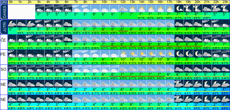 | Ura | 00h | 01h | 02h | 03h | 04h | 05h | 06h | 07h | 08h | 09h | 10h | 11h | 12h | 13h | 14h | 15h | 16h | 17h | 18h | 19h | 20h | 21h | 22h | 23h | |  |  |  |  |  |  |  |  |  |  |  |  |  |  |  |  |  |  |  |  |  |  |  |  | | Temperatura [C°] | 7°C | 6°C | 6°C | 6°C | 6°C | 5°C | 5°C | 5°C | 6°C | 7°C | 8°C | 9°C | 10°C | 10°C | 10°C | 10°C | 10°C | 9°C | 8°C | 8°C | 7°C | 7°C | 6°C | 6°C | | Občutek [C°] | 5°C | 4°C | 4°C | 4°C | 3°C | 3°C | 3°C | 3°C | 3°C | 4°C | 6°C | 7°C | 8°C | 8°C | 8°C | 8°C | 8°C | 7°C | 6°C | 5°C | 5°C | 4°C | 4°C | 4°C | | Možnost padavin | 17 % | 15 % | 19 % | 17 % | 9 % | 2 % | 1 % | 1 % | 7 % | 7 % | 8 % | 9 % | 16 % | 12 % | 25 % | 25 % | 25 % | 26 % | 25 % | 25 % | 25 % | 25 % | 7 % | 7 % | | Količina padavin [mm] | | | | | | | | | | | | | | | | | | | | | | | | | Sneg [cm] | | | | | | | | | | | | | | | | | | | | | | | | | | UV index | | | | | | | | | | | | UV 1 | UV 2 | UV 2 | UV 1 | UV 1 | UV 1 | | | | | | | | | Hitrost vetra | 5 km/h | 5 km/h | 5 km/h | 5 km/h | 5 km/h | 5 km/h | 5 km/h | 4 km/h | 4 km/h | 4 km/h | 4 km/h | 4 km/h | 5 km/h | 5 km/h | 5 km/h | 5 km/h | 5 km/h | 5 km/h | 4 km/h | 4 km/h | 4 km/h | 4 km/h | 4 km/h | 4 km/h | Smer vetra | S | S | S | Z | S | S | S | S | S | V | V | S | S | S | S | S | S | S | V | V | S | V | J | Z | | Zračni tlak | 989 | 990 | 990 | 991 | 991 | 992 | 992 | 993 | 993 | 994 | 994 | 993 | 993 | 993 | 993 | 993 | 993 | 993 | 993 | 994 | 994 | 994 | 994 | 995 | | Vlaga | 92 % | 92 % | 92 % | 92 % | 92 % | 92 % | 93 % | 93 % | 90 % | 86 % | 82 % | 77 % | 72 % | 69 % | 68 % | 68 % | 69 % | 71 % | 74 % | 77 % | 78 % | 80 % | 80 % | 82 % |