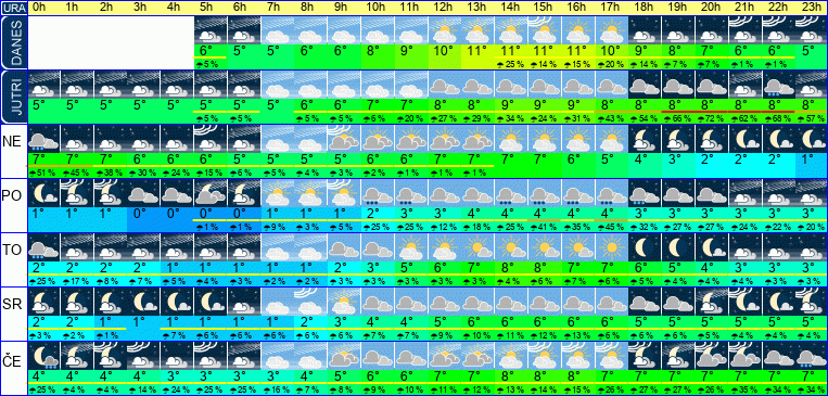 | Temperatura: | 5°C / 7°C / 9°C (+-2°C) | Možnost padavin: | 76 % | Hitrost vetra: | 3 / 5 / 8 km/h (+-4) | Skupna oblačnost: | 98 / 99 / 100 % (+-7) |