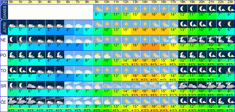 | Ura | 00h | 01h | 02h | 03h | 04h | 05h | 06h | 07h | 08h | 09h | 10h | 11h | 12h | 13h | 14h | 15h | 16h | 17h | 18h | 19h | 20h | 21h | 22h | 23h | |  |  |  |  |  |  |  |  |  |  |  |  |  |  |  |  |  |  |  |  |  |  |  |  | | Temperatura [C°] | 7°C | 6°C | 6°C | 5°C | 5°C | 5°C | 5°C | 5°C | 7°C | 9°C | 11°C | 13°C | 14°C | 15°C | 16°C | 16°C | 16°C | 14°C | 13°C | 12°C | 11°C | 10°C | 9°C | 8°C | | Občutek [C°] | 5°C | 4°C | 4°C | 3°C | 3°C | 2°C | 2°C | 3°C | 4°C | 7°C | 9°C | 11°C | 12°C | 13°C | 13°C | 13°C | 13°C | 12°C | 11°C | 10°C | 9°C | 8°C | 7°C | 6°C | | Možnost padavin | 3 % | 3 % | 2 % | 2 % | 2 % | 2 % | 2 % | 2 % | 2 % | 2 % | 3 % | 5 % | 8 % | 10 % | 12 % | 13 % | 14 % | 14 % | 15 % | 14 % | 13 % | 10 % | 8 % | 7 % | | Količina padavin [mm] | | | | | | | | | | | | | | | | | | | | | | | | | Sneg [cm] | | | | | | | | | | | | | | | | | | | | | | | | | | UV index | | | | | | | | | | | UV 1 | UV 1 | UV 2 | UV 2 | UV 2 | UV 2 | UV 1 | | | | | | | | | Hitrost vetra | 5 km/h | 5 km/h | 5 km/h | 5 km/h | 5 km/h | 4 km/h | 4 km/h | 4 km/h | 4 km/h | 4 km/h | 4 km/h | 5 km/h | 6 km/h | 6 km/h | 8 km/h | 7 km/h | 7 km/h | 7 km/h | 6 km/h | 6 km/h | 5 km/h | 5 km/h | 5 km/h | 5 km/h | Smer vetra | J | J | J | J | J | J | J | J | J | V | S | V | V | V | V | V | V | V | V | J | J | J | J | J | | Zračni tlak | 1022 | 1022 | 1022 | 1022 | 1022 | 1022 | 1022 | 1023 | 1023 | 1023 | 1022 | 1022 | 1021 | 1021 | 1020 | 1020 | 1020 | 1020 | 1021 | 1021 | 1022 | 1022 | 1023 | 1023 | | Vlaga | 80 % | 83 % | 85 % | 86 % | 87 % | 88 % | 88 % | 86 % | 85 % | 78 % | 71 % | 63 % | 56 % | 51 % | 48 % | 47 % | 48 % | 52 % | 57 % | 63 % | 67 % | 71 % | 75 % | 78 % |