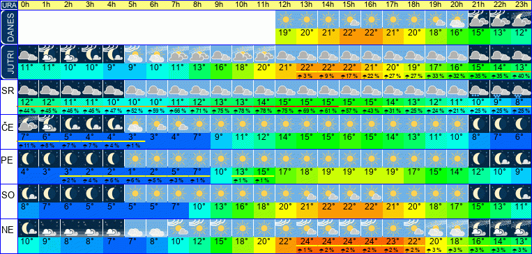 | Ura | 00h | 01h | 02h | 03h | 04h | 05h | 06h | 07h | 08h | 09h | 10h | 11h | 12h | 13h | 14h | 15h | 16h | 17h | 18h | 19h | 20h | 21h | 22h | 23h | |  |  |  |  |  |  |  |  |  |  |  |  |  |  |  |  |  |  |  |  |  |  |  |  | | Temperatura [C°] | 11°C | 11°C | 10°C | 10°C | 9°C | 9°C | 10°C | 11°C | 13°C | 16°C | 18°C | 20°C | 21°C | 22°C | 22°C | 22°C | 21°C | 20°C | 19°C | 17°C | 16°C | 15°C | 14°C | 13°C | | Občutek [C°] | 9°C | 8°C | 8°C | 8°C | 7°C | 7°C | 8°C | 10°C | 12°C | 14°C | 16°C | 17°C | 19°C | 20°C | 20°C | 20°C | 19°C | 17°C | 16°C | 15°C | 14°C | 13°C | 12°C | 11°C | | Možnost padavin | | | | | | | | | | | | | | 3 % | 9 % | 17 % | 22 % | 27 % | 27 % | 33 % | 32 % | 35 % | 35 % | 40 % | | Količina padavin [mm] | | | | | | | | | | | | | | | | | | | | | | | | | Sneg [cm] | | | | | | | | | | | | | | | | | | | | | | | | | | UV index | | | | | | | | | | UV 1 | UV 2 | UV 3 | UV 4 | UV 3 | UV 3 | UV 2 | UV 1 | UV 1 | UV 1 | | | | | | | Hitrost vetra | 6 km/h | 5 km/h | 4 km/h | 4 km/h | 4 km/h | 4 km/h | 3 km/h | 3 km/h | 4 km/h | 5 km/h | 7 km/h | 8 km/h | 9 km/h | 9 km/h | 10 km/h | 10 km/h | 10 km/h | 11 km/h | 10 km/h | 10 km/h | 9 km/h | 8 km/h | 7 km/h | 7 km/h | Smer vetra | V | V | S | V | V | J | J | S | V | S | V | V | V | V | V | V | V | V | V | V | V | V | V | V | | Zračni tlak | 1019 | 1019 | 1019 | 1019 | 1019 | 1019 | 1019 | 1019 | 1019 | 1018 | 1018 | 1018 | 1017 | 1017 | 1017 | 1017 | 1016 | 1016 | 1016 | 1017 | 1017 | 1018 | 1018 | 1019 | | Vlaga | 65 % | 69 % | 70 % | 71 % | 71 % | 70 % | 68 % | 71 % | 66 % | 58 % | 51 % | 44 % | 39 % | 37 % | 38 % | 39 % | 41 % | 44 % | 49 % | 55 % | 60 % | 66 % | 72 % | 77 % |