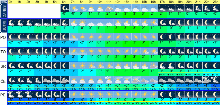 | Ura | 00h | 01h | 02h | 03h | 04h | 05h | 06h | 07h | 08h | 09h | 10h | 11h | 12h | 13h | 14h | 15h | 16h | 17h | 18h | 19h | 20h | 21h | 22h | 23h | |  |  |  |  |  |  |  |  |  |  |  |  |  |  |  |  |  |  |  |  |  |  |  |  | | Temperatura [C°] | -2°C | -2°C | -3°C | -3°C | -3°C | -3°C | -3°C | -3°C | -2°C | -1°C | 0°C | 1°C | 2°C | 3°C | 3°C | 3°C | 2°C | 1°C | 0°C | -0°C | -0°C | -1°C | -1°C | -2°C | | Občutek [C°] | -6°C | -6°C | -6°C | -6°C | -7°C | -7°C | -7°C | -6°C | -6°C | -5°C | -4°C | -2°C | -1°C | -0°C | -0°C | -0°C | -1°C | -2°C | -3°C | -3°C | -4°C | -4°C | -4°C | -5°C | | Možnost padavin | | | | | | | | | | | | | | | | | | | | | | | | | | Količina padavin [mm] | | | | | | | | | | | | | | | | | | | | | | | | | Sneg [cm] | | | | | | | | | | | | | | | | | | | | | | | | | | UV index | | | | | | | | | | | | UV 1 | UV 1 | UV 1 | UV 1 | | | | | | | | | | | Hitrost vetra | 4 km/h | 4 km/h | 4 km/h | 5 km/h | 5 km/h | 5 km/h | 4 km/h | 4 km/h | 4 km/h | 4 km/h | 4 km/h | 4 km/h | 5 km/h | 5 km/h | 4 km/h | 4 km/h | 3 km/h | 3 km/h | 3 km/h | 3 km/h | 3 km/h | 3 km/h | 3 km/h | 4 km/h | Smer vetra | Z | Z | Z | Z | Z | Z | Z | Z | Z | Z | Z | Z | Z | Z | Z | Z | Z | Z | Z | S | S | S | S | S | | Zračni tlak | 1027 | 1027 | 1027 | 1026 | 1026 | 1025 | 1025 | 1025 | 1024 | 1024 | 1024 | 1023 | 1022 | 1021 | 1020 | 1020 | 1019 | 1019 | 1019 | 1018 | 1018 | 1018 | 1018 | 1017 | | Vlaga | 86 % | 86 % | 86 % | 86 % | 85 % | 84 % | 83 % | 80 % | 77 % | 72 % | 67 % | 62 % | 59 % | 59 % | 62 % | 67 % | 71 % | 76 % | 78 % | 80 % | 82 % | 84 % | 86 % | 86 % |