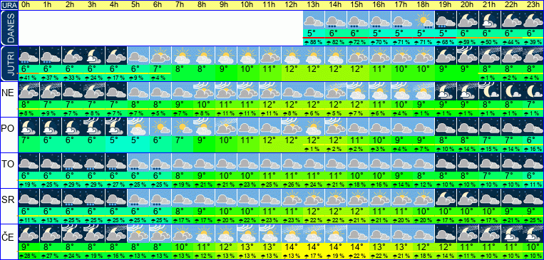 | Temperatura: | 3°C / 5°C / 6°C (+-1°C) | Možnost padavin: | 93 % | Hitrost vetra: | 29 / 31 / 34 km/h (+-7) | Skupna oblačnost: | 73 / 86 / 99 % (+-6) |