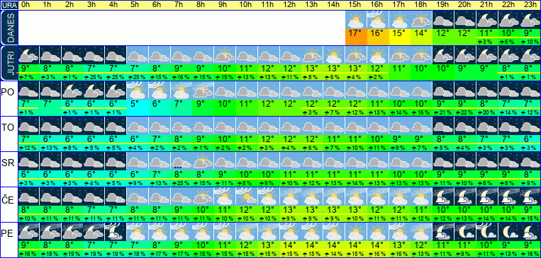 | Ura | 00h | 01h | 02h | 03h | 04h | 05h | 06h | 07h | 08h | 09h | 10h | 11h | 12h | 13h | 14h | 15h | 16h | 17h | 18h | 19h | 20h | 21h | 22h | 23h | |  |  |  |  |  |  |  |  |  |  |  |  |  |  |  |  |  |  |  |  |  |  |  |  | | Temperatura [C°] | 9°C | 8°C | 7°C | 7°C | 6°C | 6°C | 7°C | 9°C | 10°C | 11°C | 12°C | 13°C | 14°C | 14°C | 14°C | 14°C | 14°C | 13°C | 12°C | 11°C | 11°C | 10°C | 9°C | 9°C | | Občutek [C°] | 5°C | 4°C | 4°C | 3°C | 3°C | 3°C | 4°C | 6°C | 7°C | 9°C | 9°C | 10°C | 11°C | 11°C | 12°C | 12°C | 11°C | 10°C | 9°C | 9°C | 8°C | 8°C | 7°C | 6°C | | Možnost padavin | 16 % | 18 % | 19 % | 19 % | 19 % | 18 % | 17 % | 17 % | 16 % | 15 % | 15 % | 15 % | 15 % | 15 % | 14 % | 15 % | 16 % | 16 % | 13 % | 11 % | 9 % | 11 % | 13 % | 16 % | | Količina padavin [mm] | | | | | | | | | | | | | | | | | | | | | | | | | Sneg [cm] | | | | | | | | | | | | | | | | | | | | | | | | | | UV index | | | | | | | | | | UV 1 | UV 2 | UV 2 | UV 3 | UV 3 | UV 3 | UV 2 | UV 1 | UV 1 | | | | | | | | Hitrost vetra | 11 km/h | 11 km/h | 9 km/h | 8 km/h | 7 km/h | 6 km/h | 6 km/h | 6 km/h | 6 km/h | 6 km/h | 7 km/h | 7 km/h | 8 km/h | 7 km/h | 6 km/h | 6 km/h | 5 km/h | 5 km/h | 5 km/h | 4 km/h | 4 km/h | 4 km/h | 5 km/h | 4 km/h | Smer vetra | S | S | S | S | S | S | S | S | S | S | S | S | S | S | S | V | V | V | V | S | S | S | S | S | | Zračni tlak | 1008 | 1008 | 1008 | 1008 | 1008 | 1008 | 1008 | 1009 | 1009 | 1009 | 1009 | 1008 | 1008 | 1008 | 1007 | 1007 | 1007 | 1007 | 1007 | 1008 | 1008 | 1008 | 1009 | 1009 | | Vlaga | 62 % | 66 % | 70 % | 73 % | 76 % | 77 % | 74 % | 68 % | 63 % | 60 % | 57 % | 54 % | 51 % | 49 % | 48 % | 48 % | 50 % | 54 % | 58 % | 62 % | 65 % | 69 % | 73 % | 76 % |
