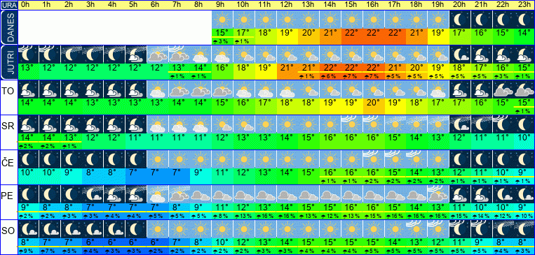 | Temperatura: | 11°C / 17°C / 22°C (+-1°C) | Možnost padavin: | 4 % | Hitrost vetra: | 3 / 6 / 8 km/h (+-5) | Skupna oblačnost: | 11 / 43 / 100 % (+-29) |