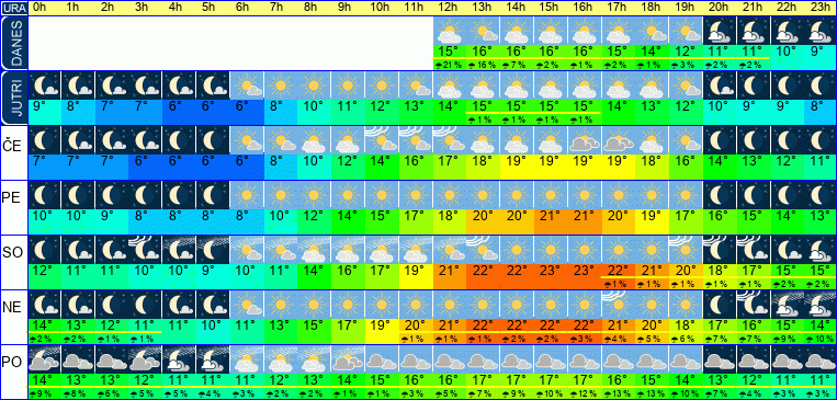 | Ura | 11h | 12h | 13h | 14h | 15h | 16h | 17h | 18h | 19h | 20h | 21h | 22h | 23h | | | | | | | | | | | | |  |  |  |  |  |  |  |  |  |  |  |  |  | | Temperatura [C°] | 15°C | 15°C | 16°C | 16°C | 16°C | 16°C | 15°C | 14°C | 12°C | 11°C | 11°C | 10°C | 9°C | | Občutek [C°] | 13°C | 14°C | 14°C | 14°C | 13°C | 12°C | 11°C | 10°C | 9°C | 8°C | 7°C | 7°C | 6°C | | Možnost padavin | 25 % | 21 % | 16 % | 7 % | 2 % | 1 % | 2 % | 1 % | 3 % | 2 % | 2 % | | | | Količina padavin [mm] | | | | | | | | | | | | | | Sneg [cm] | | | | | | | | | | | | | | | UV index | UV 3 | UV 3 | UV 4 | UV 4 | UV 3 | UV 2 | UV 2 | UV 1 | | | | | | | Hitrost vetra | 7 km/h | 8 km/h | 9 km/h | 10 km/h | 10 km/h | 11 km/h | 11 km/h | 12 km/h | 10 km/h | 9 km/h | 8 km/h | 8 km/h | 7 km/h | Smer vetra | V | V | V | V | V | S | S | S | S | S | S | S | S | | Zračni tlak | 1017 | 1017 | 1016 | 1016 | 1016 | 1016 | 1016 | 1016 | 1017 | 1017 | 1018 | 1019 | 1019 | | Vlaga | 61 % | 57 % | 52 % | 50 % | 49 % | 49 % | 50 % | 53 % | 56 % | 60 % | 61 % | 63 % | 65 % |