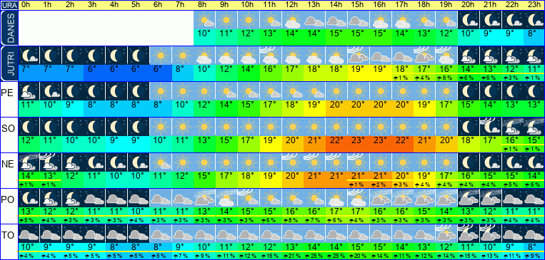 | Ura | 00h | 01h | 02h | 03h | 04h | 05h | 06h | 07h | 08h | 09h | 10h | 11h | 12h | 13h | 14h | 15h | 16h | 17h | 18h | 19h | 20h | 21h | 22h | 23h | |  |  |  |  |  |  |  |  |  |  |  |  |  |  |  |  |  |  |  |  |  |  |  |  | | Temperatura [C°] | 10°C | 10°C | 9°C | 8°C | 8°C | 8°C | 8°C | 10°C | 12°C | 14°C | 15°C | 17°C | 18°C | 20°C | 20°C | 21°C | 21°C | 20°C | 19°C | 17°C | 16°C | 15°C | 14°C | 13°C | | Občutek [C°] | 7°C | 7°C | 6°C | 5°C | 5°C | 5°C | 6°C | 8°C | 10°C | 12°C | 13°C | 15°C | 17°C | 19°C | 20°C | 20°C | 19°C | 18°C | 17°C | 16°C | 14°C | 13°C | 12°C | 11°C | | Možnost padavin | | | | | | | | | | | | | | | | | | | | | | | | | | Količina padavin [mm] | | | | | | | | | | | | | | | | | | | | | | | | | Sneg [cm] | | | | | | | | | | | | | | | | | | | | | | | | | | UV index | | | | | | | | | | UV 1 | UV 2 | UV 3 | UV 5 | UV 6 | UV 5 | UV 3 | UV 2 | UV 2 | UV 1 | | | | | | | Hitrost vetra | 6 km/h | 5 km/h | 5 km/h | 4 km/h | 4 km/h | 4 km/h | 3 km/h | 2 km/h | 2 km/h | 4 km/h | 5 km/h | 6 km/h | 6 km/h | 6 km/h | 6 km/h | 6 km/h | 6 km/h | 5 km/h | 5 km/h | 4 km/h | 4 km/h | 4 km/h | 3 km/h | 3 km/h | Smer vetra | S | S | S | S | S | S | S | S | Z | J | J | J | Z | J | Z | J | J | J | J | J | J | J | Z | S | | Zračni tlak | 1019 | 1019 | 1019 | 1019 | 1019 | 1020 | 1020 | 1020 | 1020 | 1020 | 1020 | 1020 | 1019 | 1018 | 1018 | 1017 | 1016 | 1015 | 1015 | 1015 | 1015 | 1016 | 1016 | 1016 | | Vlaga | 54 % | 57 % | 58 % | 61 % | 63 % | 65 % | 66 % | 65 % | 62 % | 54 % | 48 % | 43 % | 40 % | 37 % | 35 % | 34 % | 33 % | 35 % | 39 % | 47 % | 54 % | 58 % | 60 % | 60 % |