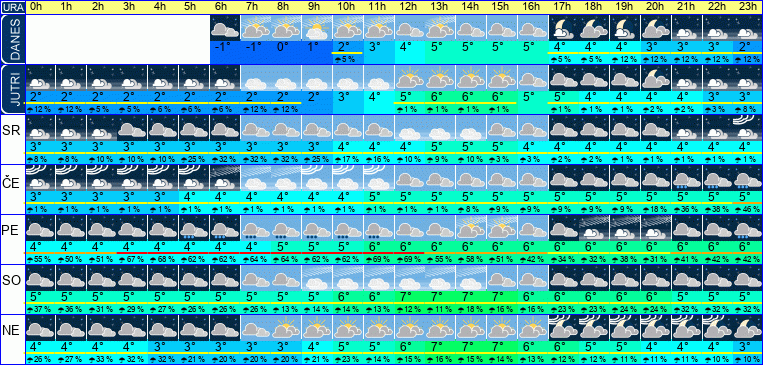 | Temperatura: | 4°C / 5°C / 6°C (+-1°C) | Možnost padavin: | 73 % | Hitrost vetra: | 4 / 5 / 5 km/h (+-3) | Skupna oblačnost: | 85 / 94 / 100 % (+-5) |