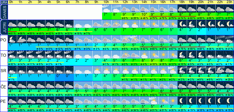 | Ura | 00h | 01h | 02h | 03h | 04h | 05h | 06h | 07h | 08h | 09h | 10h | 11h | 12h | 13h | 14h | 15h | 16h | 17h | 18h | 19h | 20h | 21h | 22h | 23h | |  |  |  |  |  |  |  |  |  |  |  |  |  |  |  |  |  |  |  |  |  |  |  |  | | Temperatura [C°] | 7°C | 7°C | 7°C | 7°C | 6°C | 6°C | 5°C | 5°C | 5°C | 5°C | 6°C | 6°C | 7°C | 7°C | 7°C | 7°C | 6°C | 5°C | 4°C | 3°C | 2°C | 2°C | 2°C | 1°C | | Občutek [C°] | 5°C | 5°C | 5°C | 4°C | 3°C | 2°C | 1°C | 1°C | 1°C | 1°C | 2°C | 2°C | 2°C | 2°C | 2°C | 2°C | 1°C | 1°C | -0°C | -1°C | -1°C | -2°C | -2°C | -2°C | | Možnost padavin | 72 % | 65 % | 46 % | 53 % | 30 % | 28 % | 27 % | 12 % | 2 % | | | | | | | | | | | | | | | | | Količina padavin [mm] | 1 mm | 1 mm | | | | | | | | | | | | | | | | | | | | | | | Sneg [cm] | | | | | | | | | | | | | | | | | | | | | | | | | | UV index | | | | | | | | | | | | UV 1 | UV 1 | UV 1 | UV 1 | UV 1 | UV 1 | | | | | | | | | Hitrost vetra | 5 km/h | 5 km/h | 6 km/h | 8 km/h | 9 km/h | 9 km/h | 10 km/h | 9 km/h | 10 km/h | 10 km/h | 10 km/h | 11 km/h | 11 km/h | 12 km/h | 11 km/h | 11 km/h | 10 km/h | 9 km/h | 8 km/h | 7 km/h | 6 km/h | 6 km/h | 6 km/h | 6 km/h | Smer vetra | S | V | S | S | S | S | Z | J | J | J | J | J | V | V | V | V | V | V | V | V | V | V | V | V | | Zračni tlak | 1002 | 1002 | 1003 | 1003 | 1003 | 1004 | 1005 | 1006 | 1007 | 1008 | 1009 | 1009 | 1010 | 1010 | 1011 | 1011 | 1011 | 1012 | 1013 | 1014 | 1014 | 1014 | 1014 | 1013 | | Vlaga | 93 % | 92 % | 94 % | 90 % | 83 % | 79 % | 76 % | 74 % | 70 % | 67 % | 65 % | 60 % | 55 % | 52 % | 51 % | 52 % | 54 % | 57 % | 62 % | 67 % | 69 % | 70 % | 69 % | 69 % |