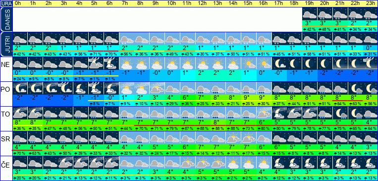 | Ura | 00h | 01h | 02h | 03h | 04h | 05h | 06h | 07h | 08h | 09h | 10h | 11h | 12h | 13h | 14h | 15h | 16h | 17h | 18h | 19h | 20h | 21h | 22h | 23h | |  |  |  |  |  |  |  |  |  |  |  |  |  |  |  |  |  |  |  |  |  |  |  |  | | Temperatura [C°] | 3°C | 3°C | 2°C | 2°C | 2°C | 2°C | 2°C | 2°C | 2°C | 3°C | 4°C | 4°C | 5°C | 5°C | 5°C | 5°C | 4°C | 4°C | 3°C | 3°C | 3°C | 2°C | 2°C | 2°C | | Občutek [C°] | -0°C | -1°C | -1°C | -1°C | -2°C | -2°C | -2°C | -2°C | -1°C | -1°C | -0°C | -0°C | 0°C | 1°C | 0°C | 0°C | -0°C | -0°C | -1°C | -1°C | -1°C | -2°C | -2°C | -2°C | | Možnost padavin | 25 % | 25 % | 25 % | 25 % | 25 % | 25 % | 25 % | 25 % | 25 % | 3 % | 3 % | 25 % | 25 % | 25 % | 25 % | 25 % | 2 % | 12 % | 12 % | 3 % | 25 % | 25 % | 25 % | 25 % | | Količina padavin [mm] | | | | | | | | | | | | | | | | | | | | | | | | | Sneg [cm] | | | | | | | | | | | | | | | | | | | | | | | | | | UV index | | | | | | | | | | | | | UV 1 | UV 1 | UV 1 | | | | | | | | | | | Hitrost vetra | 7 km/h | 7 km/h | 7 km/h | 7 km/h | 8 km/h | 8 km/h | 8 km/h | 8 km/h | 9 km/h | 9 km/h | 10 km/h | 12 km/h | 12 km/h | 13 km/h | 13 km/h | 12 km/h | 11 km/h | 11 km/h | 11 km/h | 11 km/h | 10 km/h | 9 km/h | 9 km/h | 10 km/h | Smer vetra | V | V | V | S | S | S | S | S | S | S | S | S | S | S | S | S | S | S | S | S | S | S | S | S | | Zračni tlak | 1017 | 1018 | 1018 | 1019 | 1019 | 1019 | 1020 | 1020 | 1021 | 1021 | 1022 | 1022 | 1021 | 1021 | 1021 | 1022 | 1022 | 1022 | 1023 | 1023 | 1024 | 1024 | 1024 | 1024 | | Vlaga | 84 % | 84 % | 84 % | 84 % | 84 % | 84 % | 84 % | 83 % | 81 % | 79 % | 75 % | 71 % | 68 % | 67 % | 66 % | 67 % | 70 % | 72 % | 73 % | 75 % | 76 % | 78 % | 79 % | 81 % |