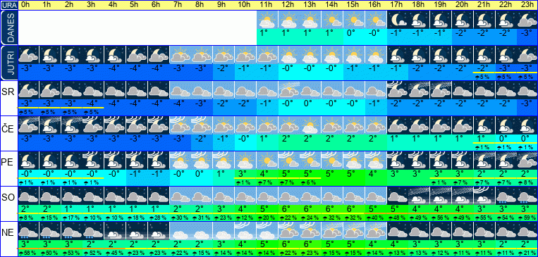| Ura | 00h | 01h | 02h | 03h | 04h | 05h | 06h | 07h | 08h | 09h | 10h | 11h | 12h | 13h | 14h | 15h | 16h | 17h | 18h | 19h | 20h | 21h | 22h | 23h | |  |  |  |  |  |  |  |  |  |  |  |  |  |  |  |  |  |  |  |  |  |  |  |  | | Temperatura [C°] | -3°C | -3°C | -3°C | -4°C | -4°C | -4°C | -4°C | -3°C | -3°C | -2°C | -1°C | -1°C | -0°C | 0°C | 0°C | -0°C | -1°C | -1°C | -1°C | -2°C | -2°C | -2°C | -2°C | -2°C | | Občutek [C°] | -7°C | -7°C | -7°C | -7°C | -7°C | -7°C | -7°C | -7°C | -7°C | -6°C | -5°C | -4°C | -4°C | -3°C | -4°C | -4°C | -4°C | -5°C | -5°C | -5°C | -5°C | -5°C | -5°C | -6°C | | Možnost padavin | | | | | | | | | | | | | | | | | | | | | | | | | | Količina padavin [mm] | | | | | | | | | | | | | | | | | | | | | | | | | Sneg [cm] | | | | | | | | | | | | | | | | | | | | | | | | | | UV index | | | | | | | | | | | | | UV 1 | UV 1 | UV 1 | UV 1 | | | | | | | | | | Hitrost vetra | 5 km/h | 5 km/h | 5 km/h | 5 km/h | 4 km/h | 4 km/h | 4 km/h | 4 km/h | 4 km/h | 4 km/h | 3 km/h | 3 km/h | 3 km/h | 3 km/h | 3 km/h | 4 km/h | 4 km/h | 4 km/h | 3 km/h | 3 km/h | 3 km/h | 3 km/h | 3 km/h | 3 km/h | Smer vetra | S | S | S | S | S | S | S | S | S | S | Z | Z | J | J | V | J | V | V | J | J | Z | Z | Z | Z | | Zračni tlak | 1025 | 1024 | 1023 | 1023 | 1022 | 1021 | 1020 | 1020 | 1019 | 1019 | 1019 | 1017 | 1016 | 1015 | 1014 | 1013 | 1013 | 1012 | 1012 | 1012 | 1011 | 1011 | 1010 | 1009 | | Vlaga | 81 % | 81 % | 82 % | 82 % | 83 % | 82 % | 82 % | 82 % | 79 % | 76 % | 72 % | 68 % | 64 % | 61 % | 61 % | 63 % | 65 % | 67 % | 70 % | 72 % | 73 % | 75 % | 76 % | 77 % |