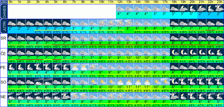 | Temperatura: | 2°C / 5°C / 8°C (+-2°C) | Možnost padavin: | 66 % | Hitrost vetra: | 4 / 5 / 6 km/h (+-3) | Skupna oblačnost: | 76 / 93 / 100 % (+-9) |