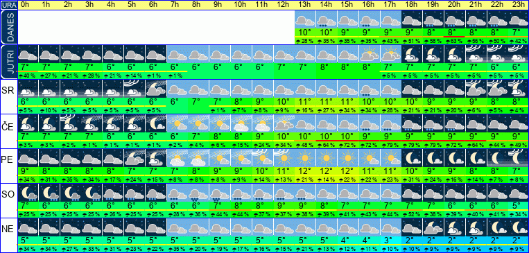 | Občutek temperature: | 5°C / 10°C / 8°C | Padavine: | 25 mm (+-12 mm) | Sunki vetra: | 10 / 17 / 23 km/h (+-0) | Visoka oblačnost: | 44 / 95 / 100 % |