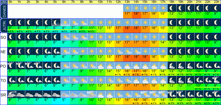 | Ura | 00h | 01h | 02h | 03h | 04h | 05h | 06h | 07h | 08h | 09h | 10h | 11h | 12h | 13h | 14h | 15h | 16h | 17h | 18h | 19h | 20h | 21h | 22h | 23h | |  |  |  |  |  |  |  |  |  |  |  |  |  |  |  |  |  |  |  |  |  |  |  |  | | Temperatura [C°] | 8°C | 8°C | 7°C | 7°C | 6°C | 6°C | 6°C | 7°C | 9°C | 11°C | 13°C | 14°C | 16°C | 17°C | 17°C | 17°C | 16°C | 14°C | 13°C | 12°C | 11°C | 10°C | 10°C | 9°C | | Občutek [C°] | 6°C | 6°C | 5°C | 5°C | 4°C | 4°C | 4°C | 5°C | 7°C | 9°C | 11°C | 13°C | 14°C | 15°C | 15°C | 15°C | 14°C | 12°C | 11°C | 10°C | 9°C | 8°C | 7°C | 7°C | | Možnost padavin | | | | | | | | | | | | | | | | | | | | | | 1 % | 1 % | 1 % | | Količina padavin [mm] | | | | | | | | | | | | | | | | | | | | | | | | | Sneg [cm] | | | | | | | | | | | | | | | | | | | | | | | | | | UV index | | | | | | | | | | | UV 1 | UV 2 | UV 2 | UV 2 | UV 2 | UV 2 | UV 1 | | | | | | | | | Hitrost vetra | 4 km/h | 4 km/h | 3 km/h | 3 km/h | 3 km/h | 3 km/h | 3 km/h | 3 km/h | 3 km/h | 3 km/h | 3 km/h | 4 km/h | 4 km/h | 4 km/h | 5 km/h | 5 km/h | 5 km/h | 5 km/h | 4 km/h | 4 km/h | 4 km/h | 4 km/h | 3 km/h | 3 km/h | Smer vetra | S | S | S | S | S | S | S | S | S | V | V | J | J | J | J | J | J | V | V | V | V | S | S | S | | Zračni tlak | 1026 | 1026 | 1026 | 1026 | 1026 | 1026 | 1026 | 1026 | 1026 | 1026 | 1026 | 1025 | 1024 | 1024 | 1023 | 1023 | 1022 | 1022 | 1022 | 1023 | 1023 | 1023 | 1023 | 1023 | | Vlaga | 77 % | 78 % | 79 % | 81 % | 83 % | 85 % | 84 % | 82 % | 74 % | 66 % | 59 % | 54 % | 50 % | 46 % | 43 % | 43 % | 46 % | 50 % | 55 % | 60 % | 62 % | 64 % | 66 % | 68 % |