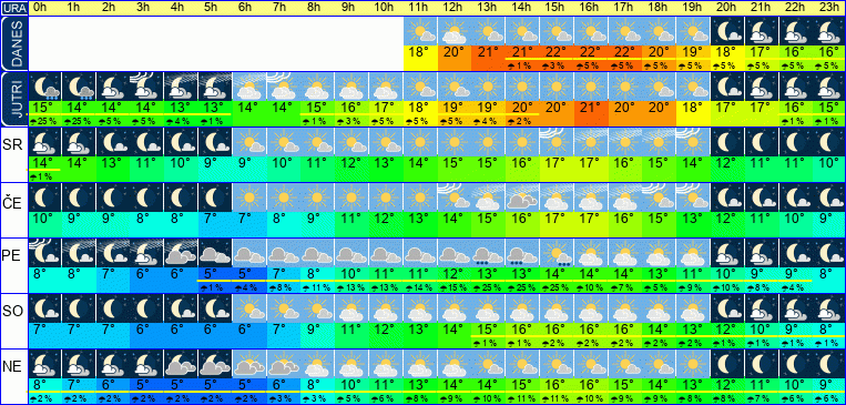 | Občutek temperature: | 10°C / 18°C / 22°C | Padavine: | 0 mm (+-0 mm) | Sunki vetra: | 12 / 22 / 32 km/h (+-0) | Visoka oblačnost: | 0 / 25 / 75 % |